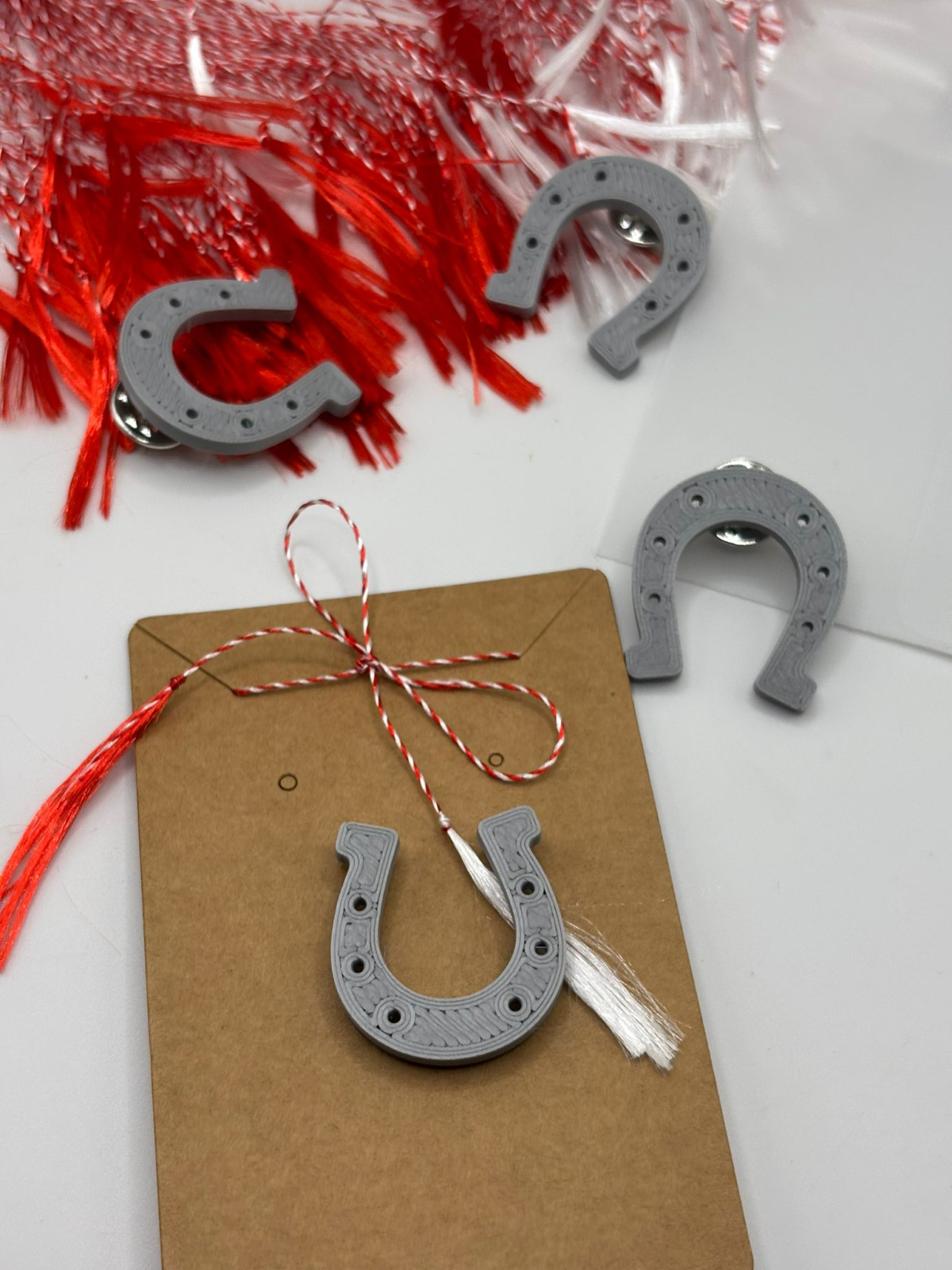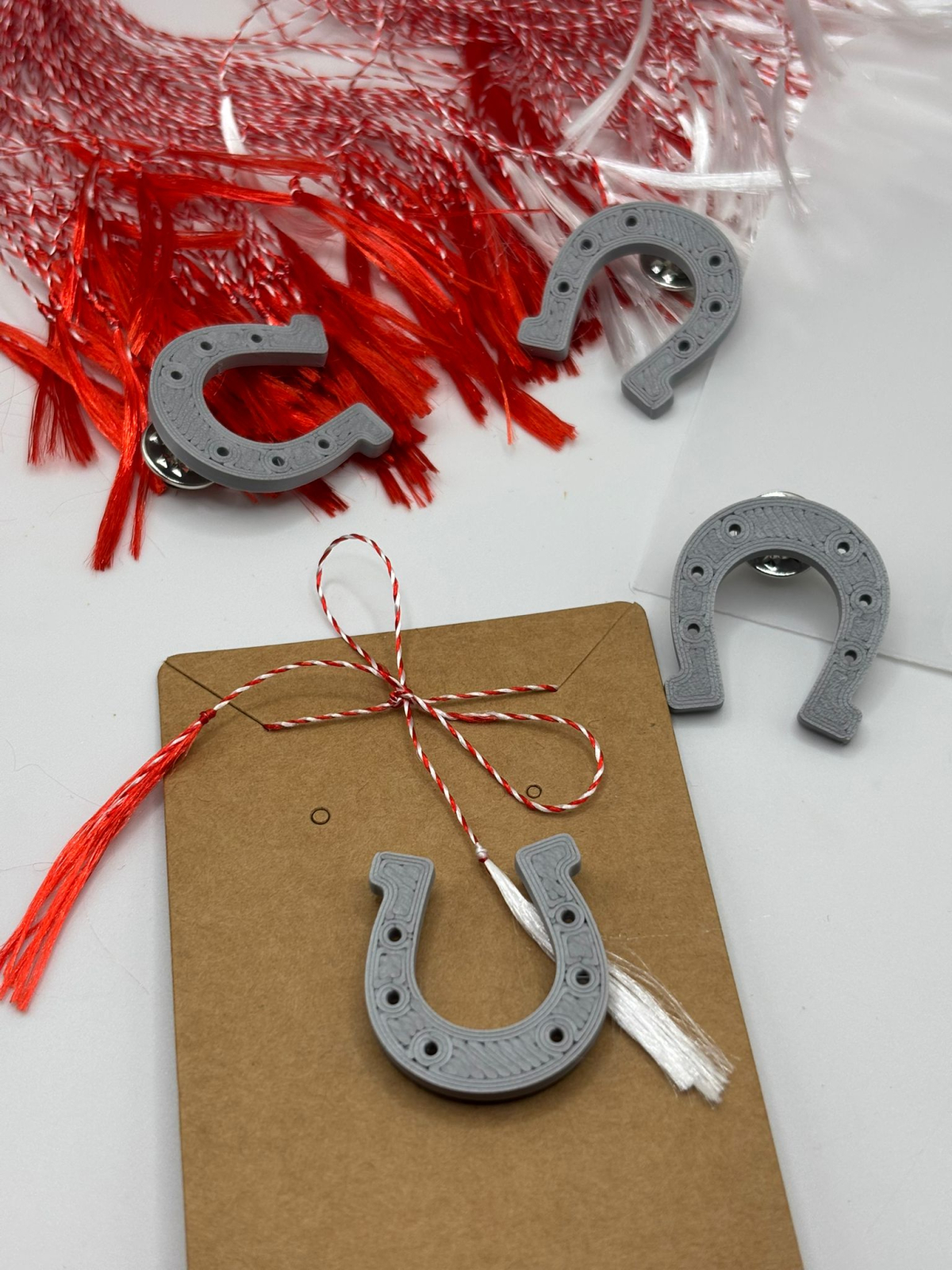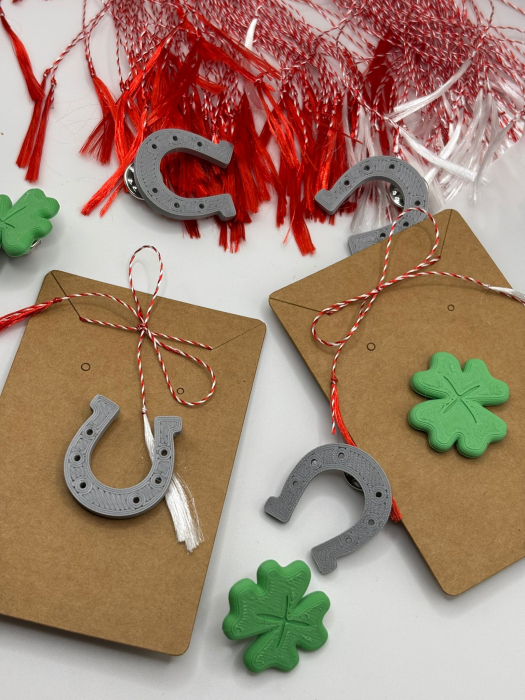 Mărțișor din categoria Noroc, realizat prin printare 3D, disponibil în două variante: potcoavă sau trifoi cu 4 foi. Prevăzut cu sistem de prindere tip broșă.