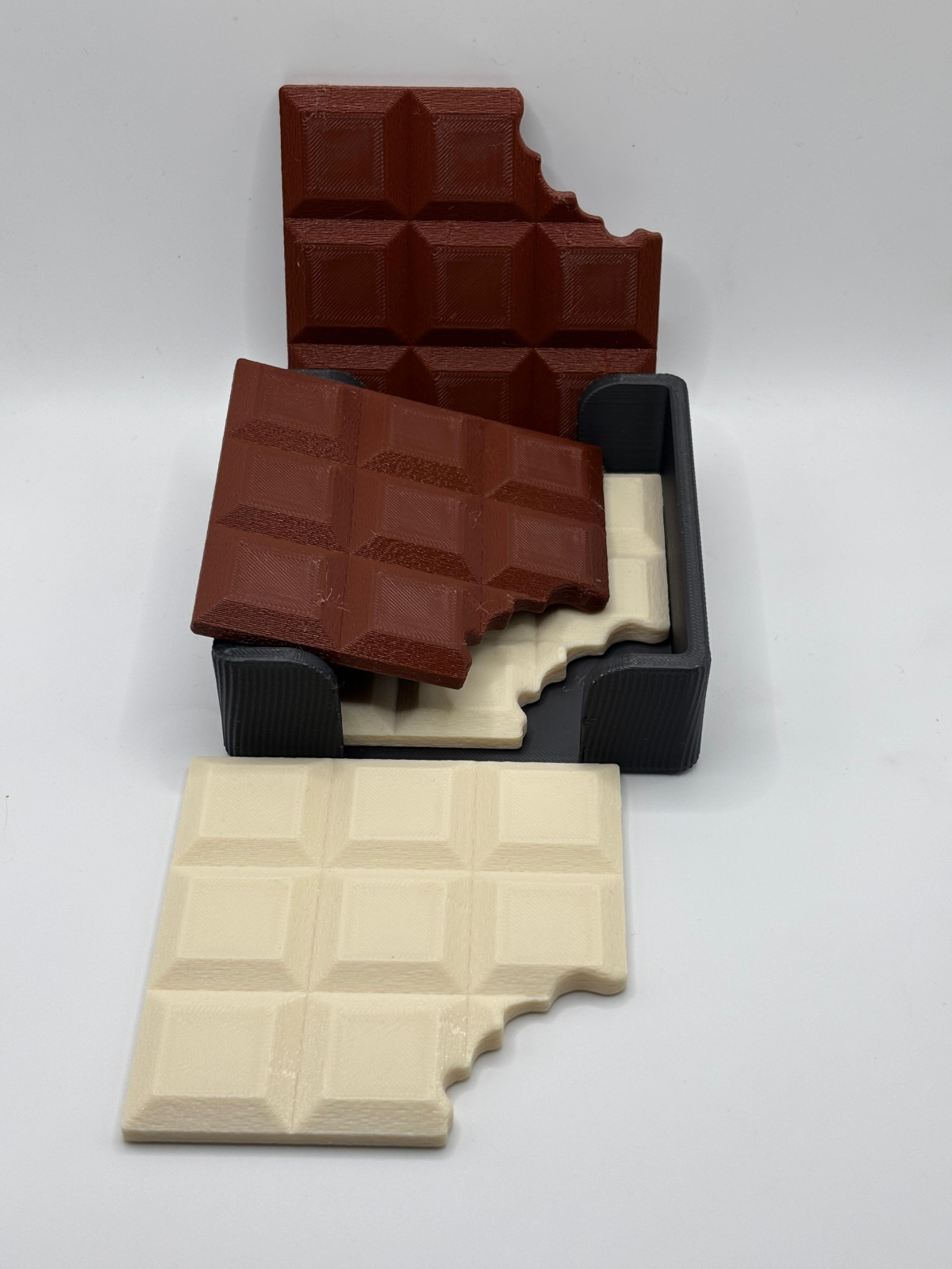 Acest pachet promoțional printat 3D este alegerea ideală pentru cei care doresc atât funcționalitate, cât și un design creativ. Setul conține 4 suporturi de cană/pahar (coastere) în formă de tabletă de ciocolată mușcată (2 cu ciocolata alba si 2 cu ciocolata neagra), alături de 1 suport pentru coastere, special conceput pentru depozitarea acestora.